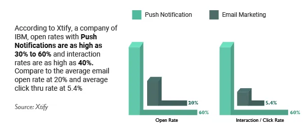 Just 20% of people open emails, but 60% of users open push notifications. Compared to just 5.4% of emails, 40% of recipients click or interact with a push notification after it has been opened. Push notifications are unquestionably a more effective method of communicating with your clients. This is because there is nothing the consumer needs to do.
